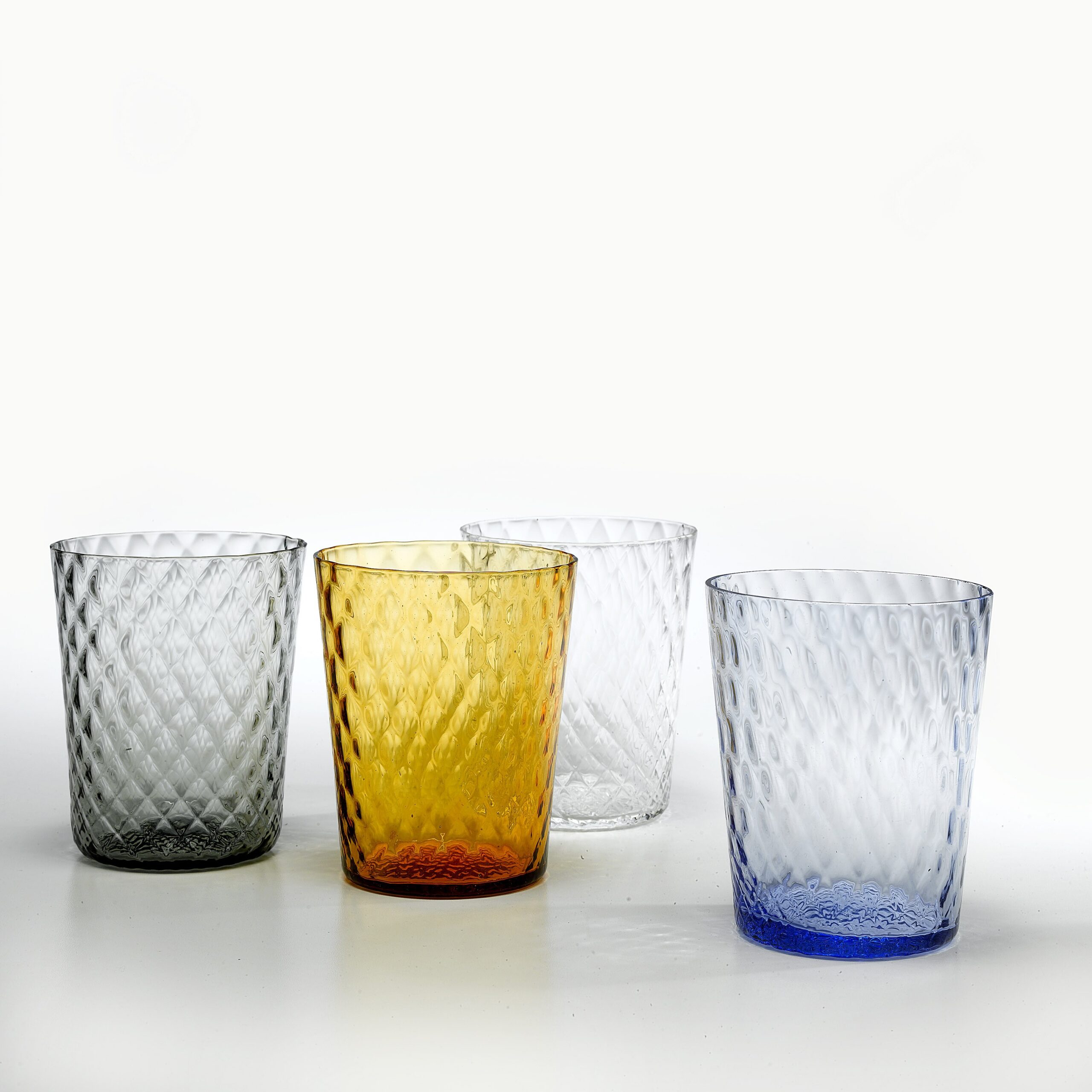 Isolano kollektionen, der er lavet af massefarvet, håndblæst og håndlavet soda-limeglas, fås i seks farver rav, ametyst, blå, grøn, grå og lyseblå.